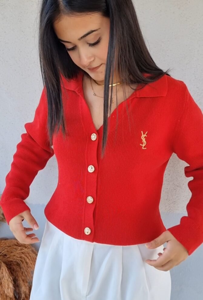 Kırmızı gold düğme triko